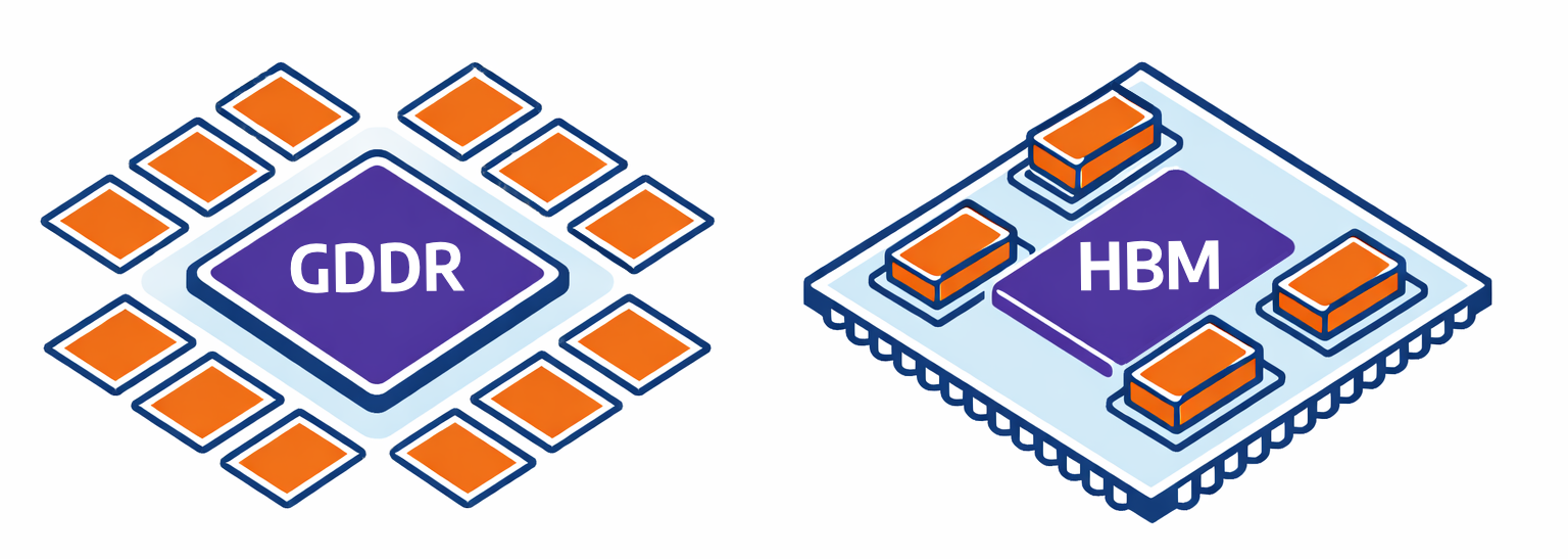 HBM (High-Bandwidth Memory) je typická pro AI GPU. Paměťové čipy jsou zde vrstveny na sebe do větších bloků a propojeny širokou, ale krátkou sběrnicí. Díky šířce sběrnice dosahuje tato paměť obrovské propustnosti (až několik TB/s) a efektivity při práci s velkými objemy dat.